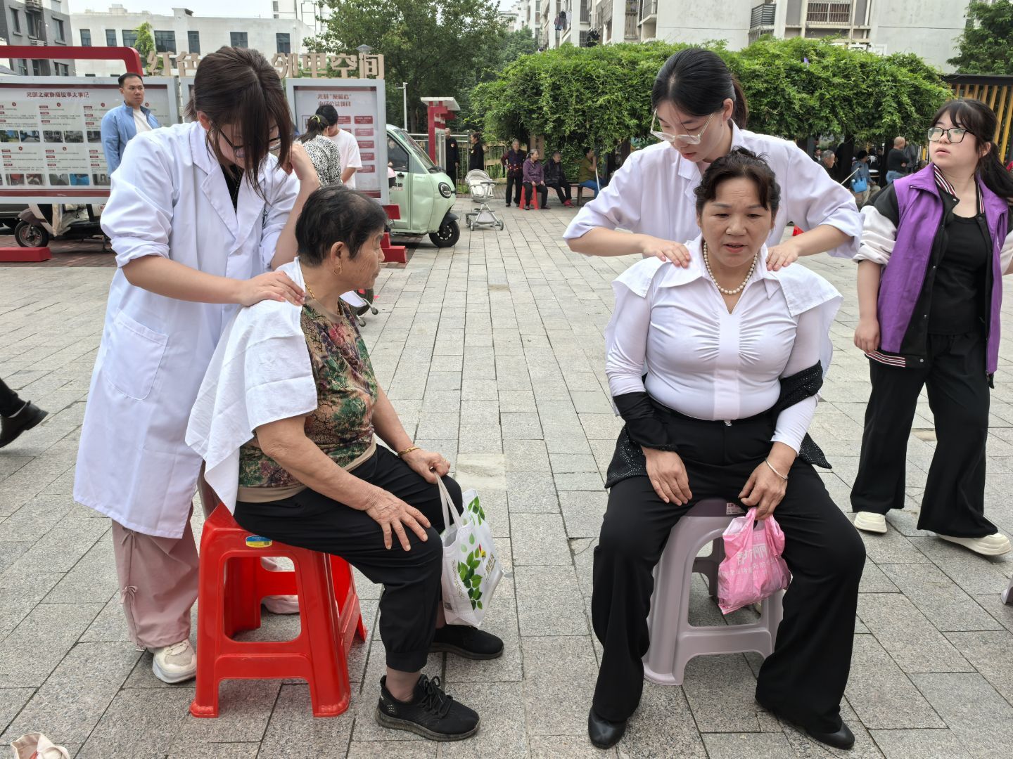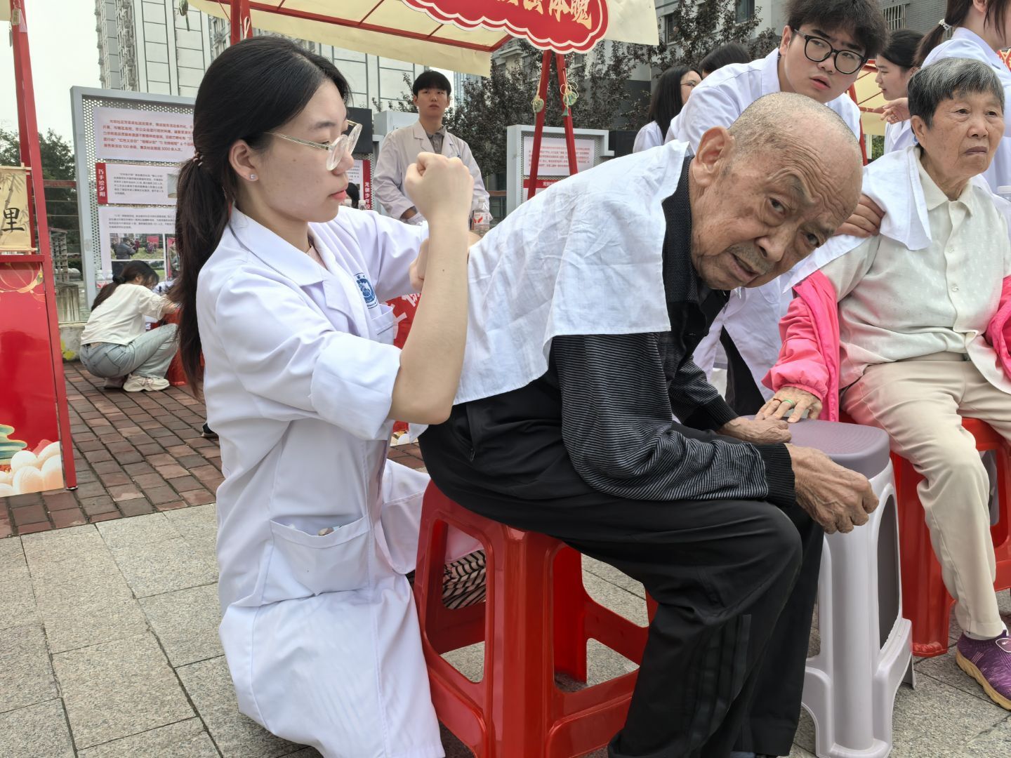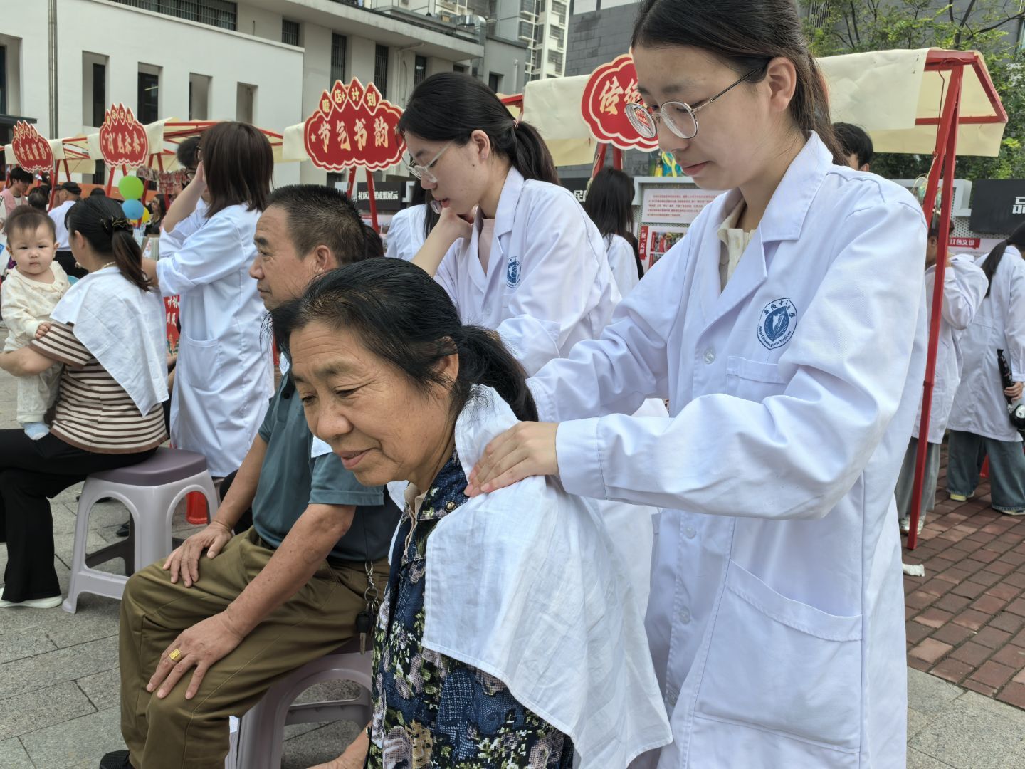 活動現場,推拿與艾灸兩大服務板塊有序推進,成為學社成員檢驗專業技能的“實戰賽場”。在推拿服務中,成員們將課堂所學的穴位知識與推拿手法應用于實踐,針對老年人常見的肩頸問題,通過按摩風池穴、肩井穴緩解不適,在與居民的互動中不斷調整手法力度,提升服務精準度。