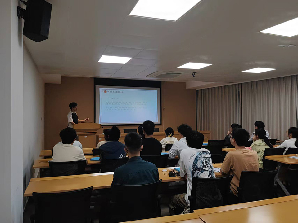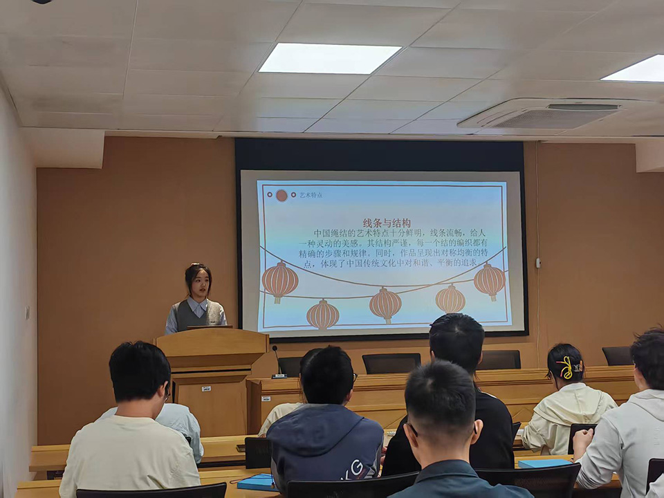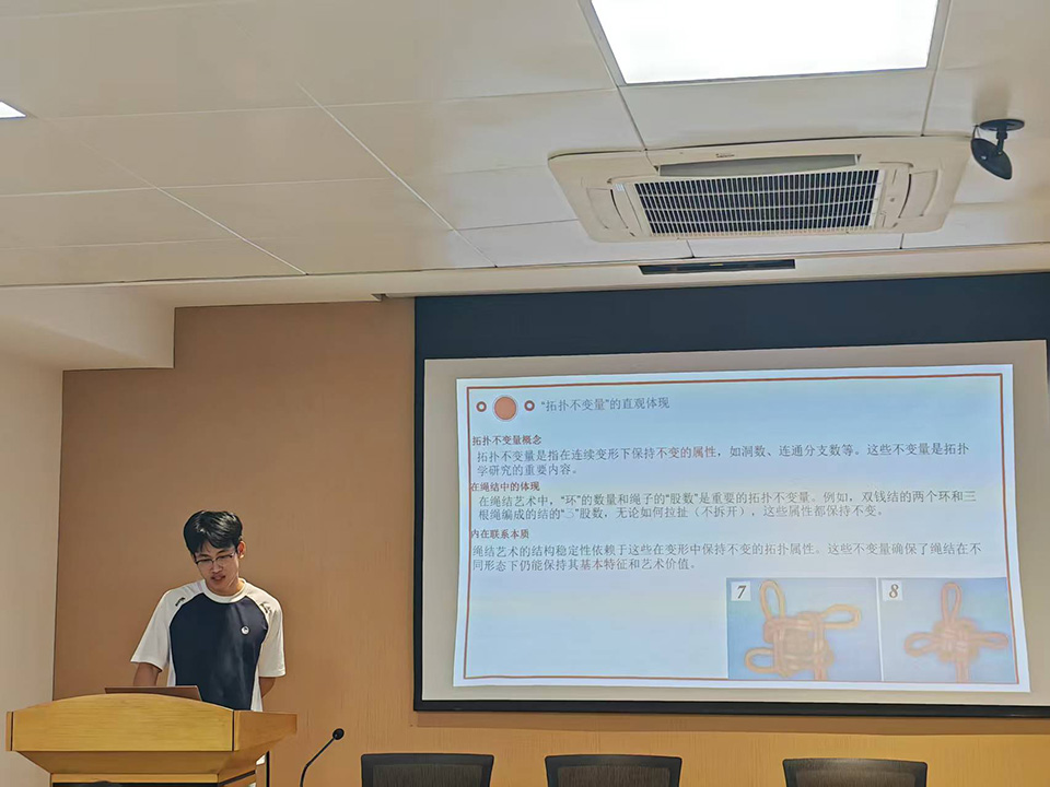 活動現場設置了理論分享環節。活動伊始,支部成員曹淑穎同學圍繞中國繩結藝術展開介紹,從其千年歷史傳承到“吉祥如意”的文化寓意,再到雙環結、萬字結等經典樣式,生動勾勒出傳統繩結的立體圖景;隨后,支部成員謝奇達同學聚焦專業視角,深入淺出地解析中國結與拓撲學的核心內在聯系,用通俗語言揭示繩結纏繞、閉合背后的數學邏輯,讓抽象的拓撲概念變得可感可知。理論分享結束后,支部成員動手實踐編制中國結,在穿、繞、拉、結的過程中親身體驗數學原理在傳統技藝中的應用,現場氛圍熱烈。