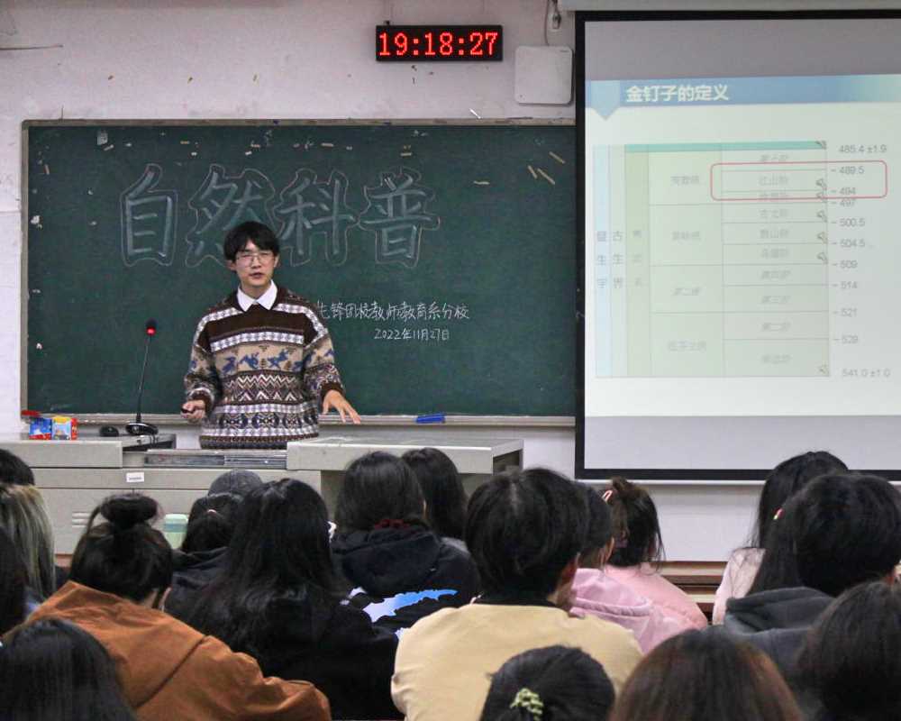 曹豐琳以“金釘子概況”、“江山階金釘子”、“金釘子的科學科普意義”三個方面進行授課,他指出,每一顆“金釘子”的建立,都是一個復雜的系統(tǒng)工程,需要地質科學經歷數年,甚至數十年的研究與反復對比、通過激勵的國際競爭和眾多國際地質專家的多輪投票表決,才能被國際地質科學聯合會、國際地層委員認可,他希望,同學們可以積極關注和參與到自然科普活動,用實際行動關心與愛護身邊環(huán)境與生態(tài),