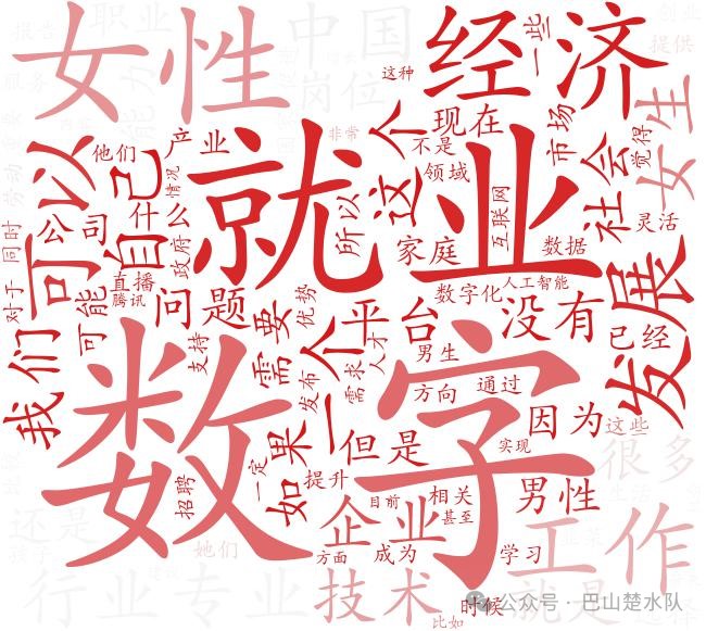 為了解女性就業現狀以及數字經濟時代下女性就業的不同影響因素,補充調研結果,我們利用八爪魚軟件對百度、知乎、騰訊新聞、新浪網等網站中關于“數字經濟 女性就業”的內容進行數據挖掘,繪制成詞云圖。