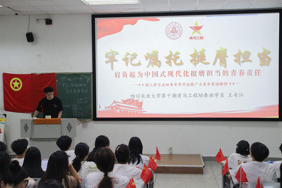此次班團活動以齊唱團歌開篇,歌聲激昂,激勵川農學子奮力向前,努力書寫青春篇章。隨后,活動進入下一環節——“學深悟透五四寄語,奮力書寫青春篇章”。首先,主持同學以習近平主席的五四青年寄語為導入,闡述了青年以及青年精神的重要性。接著,通過線上易班答題的形式,展示了同學們對五四運動相關知識的了解和掌握情況。同學們積極參與,其優秀的線上成績展現了同學們扎實的理論功底和濃厚的愛國情懷。為進一步激發同學們的青春熱情,活動還播放了四川農業大學制作的MV《青春的誓言》。MV以優美的旋律和充滿青春感的畫面,展現了川農學子們立下青春誓言,為夢想奮斗、為祖國奉獻的堅定信念和決心。讓同學們在觀看過程中能深深體會青年的責任與擔當,為實現中華民族偉大復興的中國夢貢獻自己的力量。