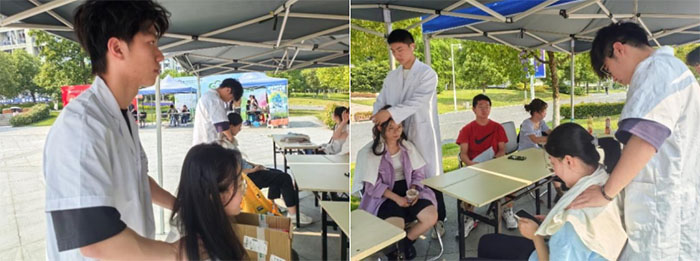 從“心”出發(fā),養(yǎng)出“針”健康——便民推拿活動 浙江中醫(yī)藥大學第三臨床醫(yī)學院晨曦針推醫(yī)院派出經(jīng)驗豐富、手法熟練的醫(yī)學志愿者來到活動現(xiàn)場,運用自身所學專業(yè)知識和技能,為前來體驗的同學們進行一些基礎(chǔ)的一對一按摩,套用揉、推、撥、滾、點、拍打等手法,為他們改善肌肉勞損引起的疼痛和肌肉僵硬等身體不適的癥狀。在體驗過程中,推拿的志愿者們還耐心地為同學們講解了推拿的基本原理和功效,讓同學們認識到推拿作為中醫(yī)的一種獨特療法,可以起到疏通經(jīng)絡(luò)、糾正錯位,活血化瘀,預(yù)防肩頸疾病的作用。同時,醫(yī)學志愿者還糾正了同學們一些錯誤的生活方式,例如睡覺時側(cè)躺容易導(dǎo)致高低肩,久坐或久站容易導(dǎo)致腰肌勞損。同學們也紛紛表示要養(yǎng)成良好的健康習慣。