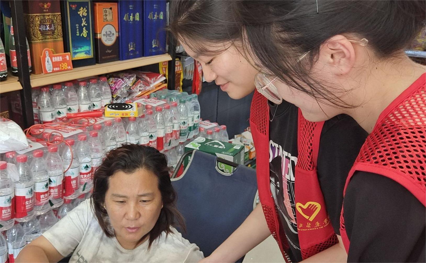 圖為隊員們為社區便利店店主講解宣傳冊。中國青年網通訊員 許蕓悅 供圖