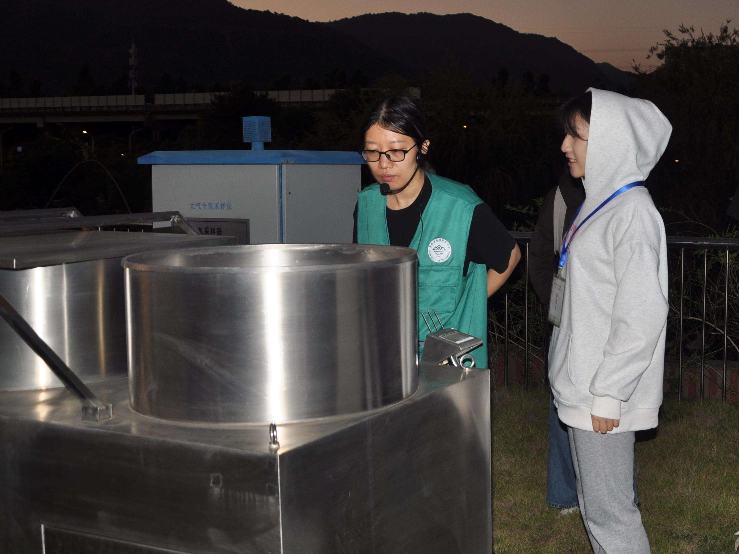 而后由工作人員帶領同學們前往基站站房平臺參觀采樣裝置,為同學介紹大流量氣溶膠采樣器及碘化鈉能譜儀的工作原理,并將干濕雨水采樣器作為介紹重點進行實際操作展示。整個科普教育環節內容充實、氛圍活躍,同學們收獲頗豐。