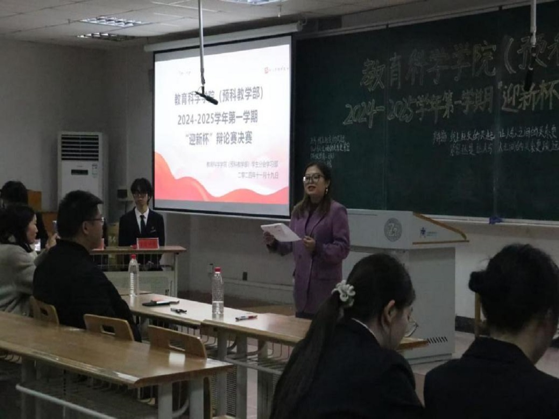 為了提高學生思辨能力,培養綜合素質,2024年11月19日19時,教育科學學院(預科教學部)于厚德樓B棟411教室開展了教育科學學院(預科教學部)2024-2025學年第一學期“迎新杯”辯論賽決賽。院小學教育教研室主任鐘妮,專業教師楊雅芳、院輔導員蔣如瀾、匡衡、樊欣擔任本次辯論賽的評委。辯論賽由時佳琳同學主持。