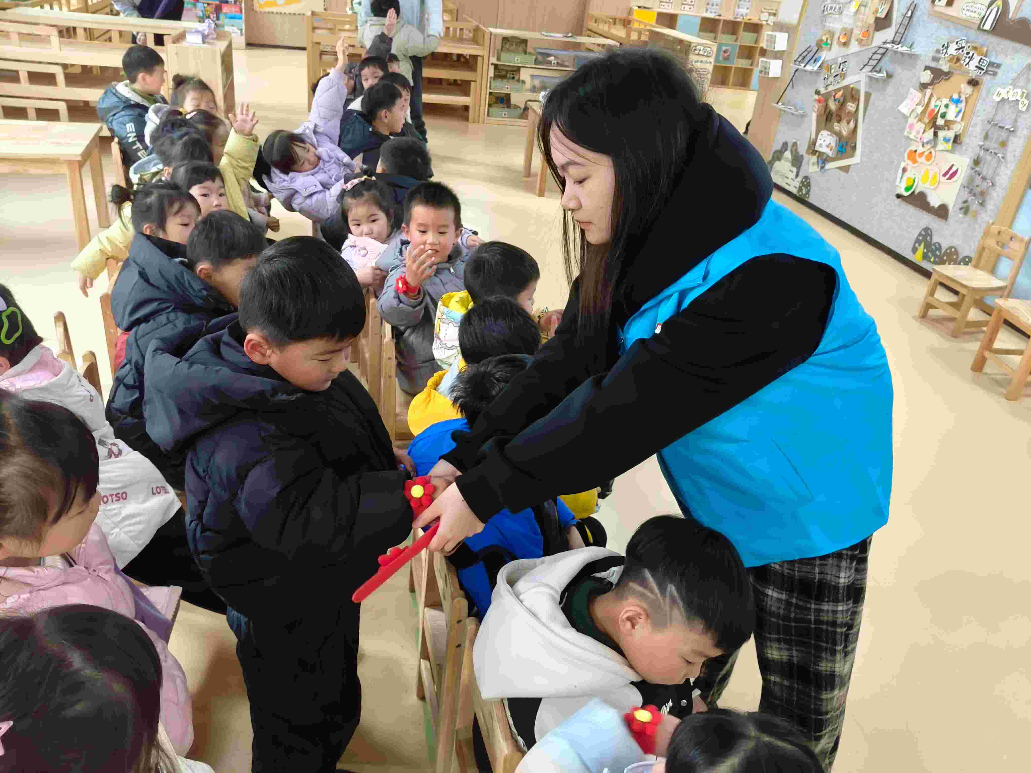 圖為志愿者獎勵答對問題的小朋友小紅花。楊百慧 攝