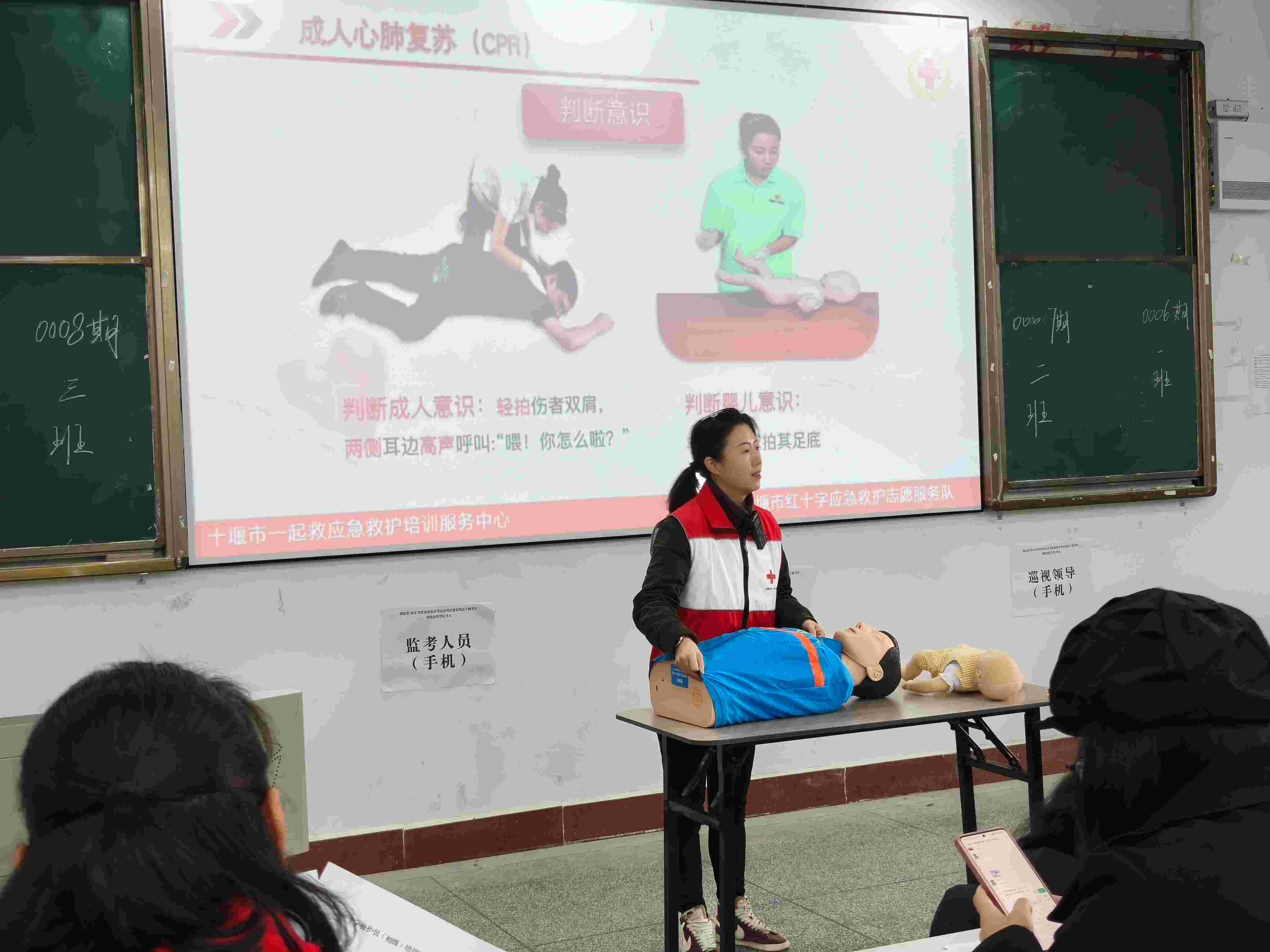 在理論學習之后,同學們立即投入到緊張而有序的實操演練中。他們在老師的指導下反復練習,直至完全掌握了所學技巧。最終,所有學員均順利通過了嚴格的考核,并獲得了十堰市紅十字會急救中心頒發的《急救技能認證證書》。