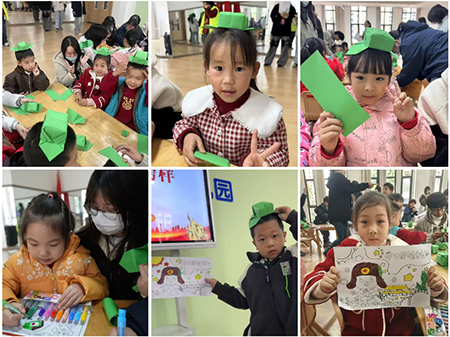 巧手偕夢:繪就雷鋒新畫卷在“大手偕小手,折出心中夢”手工環節,團員與兒童結對完成雷鋒主題折紙創作。在折“雷鋒帽”過程中,團員引導兒童理解“動手實踐”與“互助合作”的意義,現場洋溢著寓教于樂的氛圍。隨后的“小手繪雷鋒,愛心傳萬家”繪畫活動中,大小朋友共同描繪雷鋒助民場景,一幅幅童趣畫作展現雷鋒精神的多元內涵,進一步強化兒童對榜樣力量的認知;顒蝇F場氣氛熱烈,討論聲與畫筆摩挲紙張的聲音相互交織。孩子們用質樸的語言,表達著對雷鋒精神的認識,從 “幫助別人快樂自己”,到 “要像雷鋒叔叔一樣努力學習”。