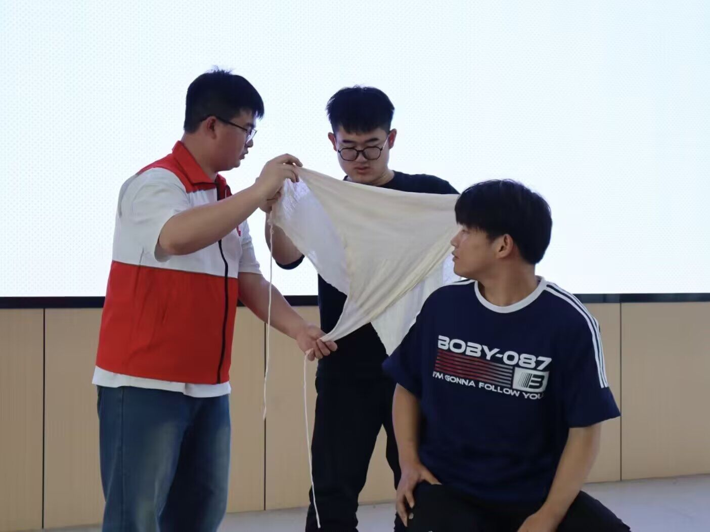 圖為志愿者指導(dǎo)同學(xué)使用繃帶。彭思楠 拍攝