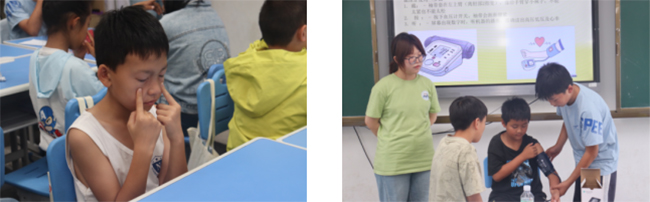 7月11日,實踐團成員示范標準眼保健操六節手法,學員分組互評確保穴位定位準確。生理課程教授靜息/運動心率監測技術、血壓計規范操作流程。學員制作《健康監測手冊》,記錄“用眼20分鐘需遠眺”“定期血壓檢測”等家庭健康管理要點。